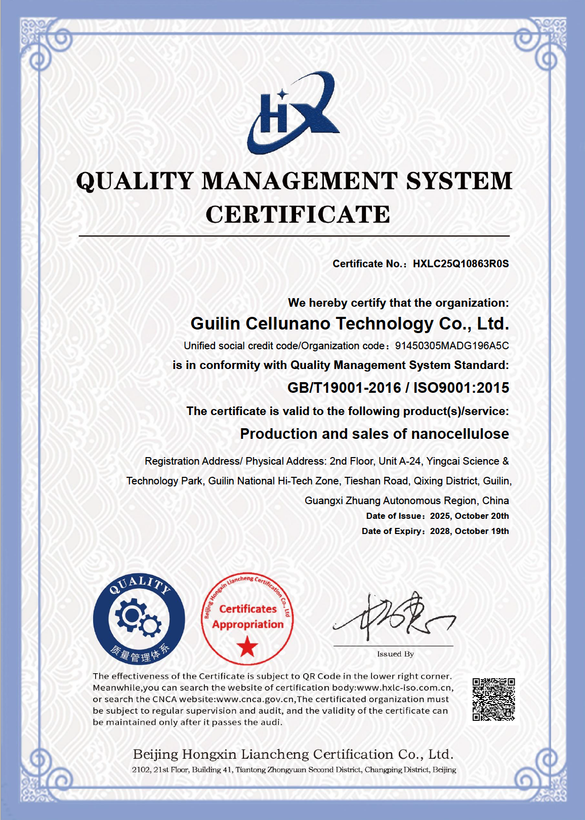 桂林市赛路纳科技有限公司顺利通过ISO9001质量管理体系认证,是公司发展历程中的重要里程碑。相信在全体员工的共同努力下,公司将以更优质的产品和服务赢得客户信赖与支持,实现可持续发展,打造全球领先的纳米纤维素产业,推动中国民族纳米纤维素产业的发展和壮大而不懈奋斗!